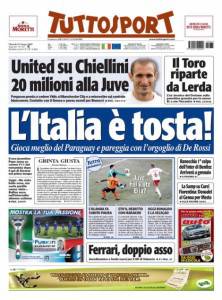 Il quotidiano torinese Tuttosport parla di un’Italia tosta, grintosa, che ieri è sembrata in buone condizioni fisiche contro un Paraguay che non ha dato grandi grattacapi alla difesa azzurra. Il gol del vantaggio dei sudamericani è nato da un’incertezza di Cannavaro e De Rossi, ma è stato proprio il romanista a trovare il guizzo vincente su angolo battuto da Pepe.