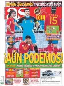 Il quotidiano madrileno As parla della sconfitta clamorosa della Spagna contro la Svizzera. Le “Furie Rosse” hanno fallito il debutto Mondiale e adesso il prossimo match è già decisivo per la qualificazione. Nonostante tutto il c.t. Vicente Del Bosque ci crede ancora e annuncia qualche cambiamento nel prossimo match, anche se ieri la Spagna ha comunque mostrato un buon calcio.