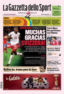 La Gazzetta dello Sport parla della clamorosa sconfitta della Spagna contro la Svizzera. Un risultato clamoroso visto che i Campioni d’Europa in caric sono tra i favoriti per la vittoria finale. Buona la prova di Xavi e soci che non hanno sfruttato le innumerevoli azioni da gol sventate anche da un super Benaglio, portiere elvetico. Il gol vittoria è stato realizzato da Fernandes.