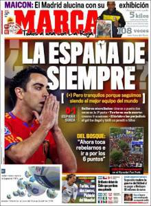 Il quotidiano spagnolo Marca parla della clamorosa sconfitta della Spagna di Vicente Del Bosque nel debutto Mondiale contro la Svizzera. Il giornale iberico striglia Xavi e soci parlando di “solita Spagna” che nella manifestazione mondiale ha quasi sempre deluso le grandi aspettative. Il c.t. spagnolo ha parlato di “giocatori senza carattere” e promette novità per la prossima partita decisiva del girone.
