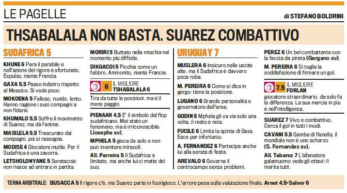 JOHANNESBURG (Sudafrica) – L’Uruguay di Tabarez viene esaltato da tutti dopo la grande prestazione di ieri sera con il Sudafrica. Voti altissimi per Forlan, mattatore della serata con una doppietta.