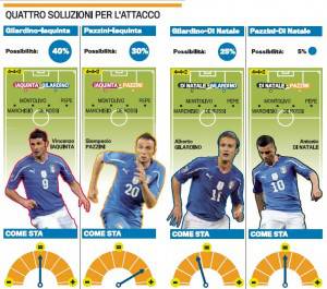 CENTURION (Sudafrica) – Marcello Lippi studia le possibili coppie d’attacco con la Nuova Zelanda. In pole ancora il duo Gilardino-Iaquinta, con l’attaccante viola insidiato da Pazzini. Il bomber doriano sta scalando posizioni ed ha scavalcato Di Natale, per il quale si prospetta al 90% una panchina. Domenica pomeriggio sapremo chi saranno i prescelti di Marcello Lippi.