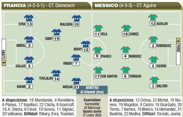 CITTA’ DEL CAPO (Sudafrica) – La Francia di Domenech, stasera, si gioca una buona fetta delle residue possibilità mondiali contro il Messico: i transalpini, guidati da Henry, daranno l’assalto ai temibili centroamericani, che hanno già dimostrato nell’amichevole contro la nostra Nazionali di essere molto temibili. Sfida ad alta velocità tra i vari Ribery, Vela & co…