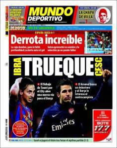Il quotidiano catalano Mundo Deportivo presta molta attenzione al calciomercato del Barcellona che starebbe per cedere il centrocampista ivoriano Tourè al City. Non solo, perchè i catalani vorrebbero inserire Zlatan Ibrahimovic nell’affare che dovrebbe portare Fabregas al Barcellona. Lo svedese è ufficialmente sul mercato come rivelato ieri dal nuovo presidente Sandro Rosell.