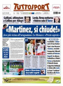 Il quotidiano torinese Tuttosport riprende il discorso del Corriere dello Sport sull’affare Martinez. L’uruguagio del Catania è ad un passo dalla Juventus. Il dirigente del Catania Lo Monaco ha confermato indirettamente la conclusione dell’affare, anche se Marotta vuole prima vedere l’evolversi della situazione di Milos Krasic, esterno serbo del Cska Mosca.