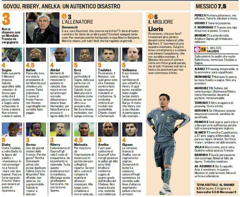 MILANO – La ‘brutta Francia’, già vista due anni fa agli Europei e rivista ieri sera, sconfitta per 2 a 0 dall’ottimo Messico, è solo una pallida imitazione di quella che in Germania, nel 2006, rese complicatissima la vittoria azzurra della Coppa del Mondo. La stampa francese non ha dubbi la colpa è del ct Raymond Domenech e i giornali italiani, per una volta, concordano al 100%. Ecco le pagelle della ‘Gazzetta dello Sport’ in merito alla partita contro i centroamericani che ha sancito la probabile eliminazione della squadra transalpina.