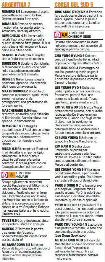 JOHANNESBURG (Sud Africa) – L’Argentina di Maradona distrugge con un secco 4-1 la Corea del Sud e ipoteca il passaggio agli ottavi di finale del Mondiale. Il Migliore in campo per l’Argentina, è stato Higuain autore di una tripletta e la sua prestazione ha dato ragione a Maradona che lo preferisce a Milito. Il peggiore è stato Demichelis colpevole sul gol subito. Per la Corea del Sud da segnalare l’ottima prestazione di Oh Beom Seok che ha contrastato molto bene Di Maria. Il peggiore è stato Park Chu Young autore dell’autorete che ha spianato la strada al successo dell’Argentina.
