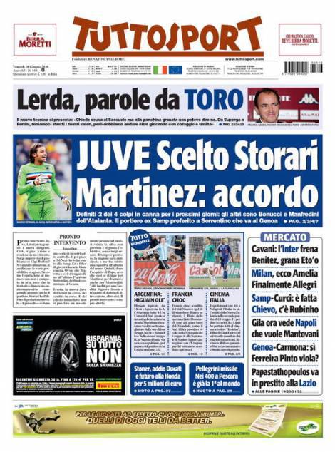 Su Tuttosport si parla ovviamente del calciomercato della Juventus. I bianconeri hanno definito l’acquisto di Marco Storari, portiere del Milan, che è stato prelevato dai rossoneri per una cifra vicina ai 5 milioni di euro. Non solo, perchè anche con l’uruguagio Martinez del Catania c’è l’accordo. Nei prossimi giorni dovrebbe esserci l’ufficialità della trattativa, come confermato dal dirigente degli etnei Lo Monaco.