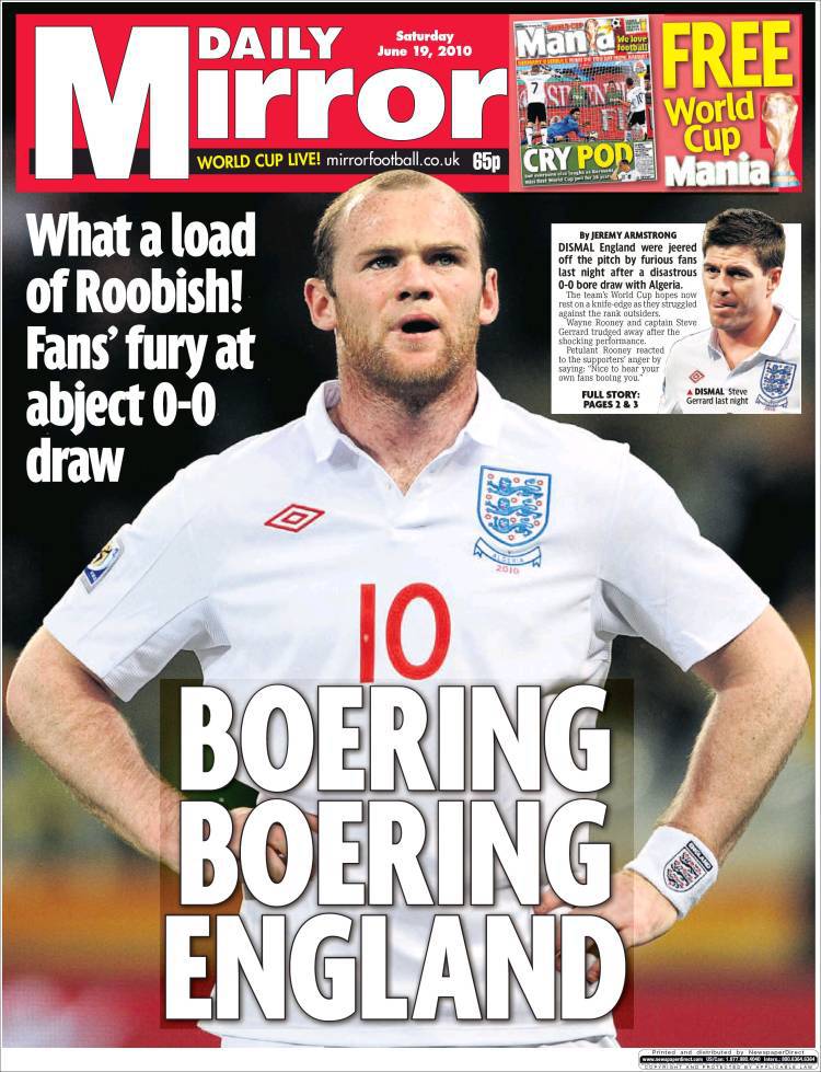 Anche la stampa inglese non è tenera nei confronti dell’Inghilterra che conquista l’ennesimo pareggio in due partite dei Mondiali. Ora per il c.t. Capello servirà la vittoria contro la Slovenia. Il Daily Mirror parla di una squadra noiosa e senza idee, in cui non viene risparmiato nessun giocatore, in particolare presi di mira Gerrard e Rooney il manifesto della pessima prova inglese.