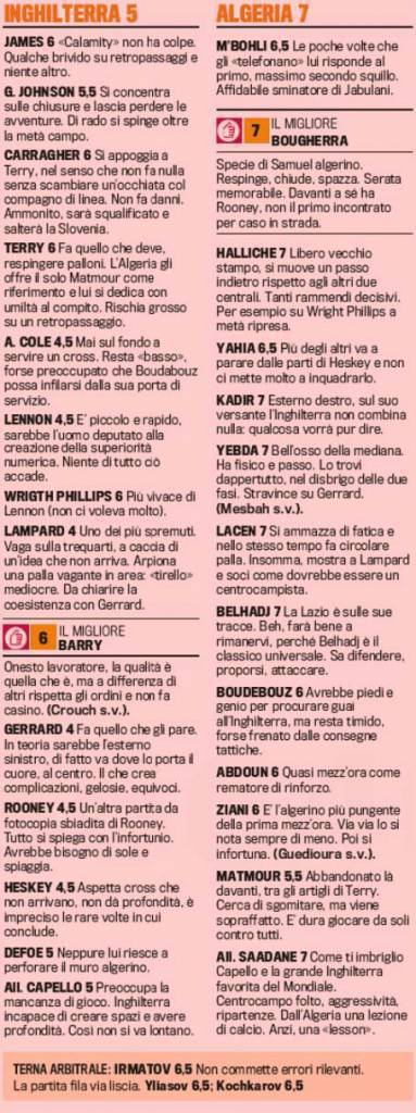JOHANNESBURG (Sudafrica) – Clamoroso flop finora dell’Inghilterra del nostro connazionale Fabio Capello che dopo due partite è fermo a 2 punti nel Girone C, dopo il pareggio con gli Stati Uniti d’America è arrivato anche il secondo pareggio consecutivo contro l’Algeria ieri sera. Stranissimo infatti che molti campioni della nazionale inglese come Rooney sono stati impalpabili, ecco a voi le pagelle della gara prese dalla Gazzetta dello Sport.