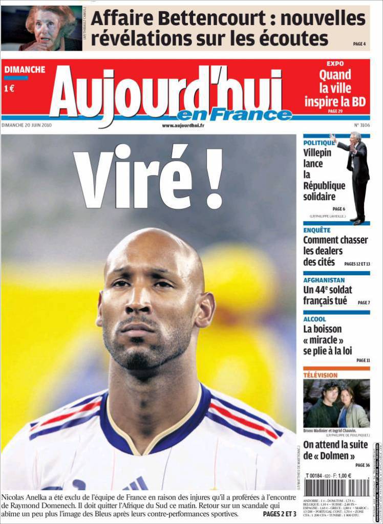 PARIGI (Francia) – La prima pagine del quotidiano francese Aujourd’hui riporta la discussione tra Nicolas Anelka con il ct francese Raymond Domenech che ha portato all’esclusione dalla rosa dei 23 per il Mondiale per l’attaccante del Chelsea che si è ribellato e ha detto parole non molto gentili all’allenatore, è intervenuta la federazione francese: l’attaccante doveva scusarsi ma lui non si è voluto scusare e per questo dovrà lasciare il Sudafrica, per lui il Mondiale finisce qui.