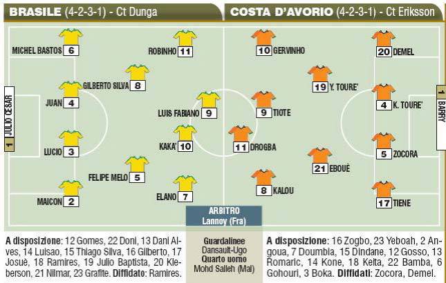 JOHANNESBURG (Sudafrica) – Stasera si giocherà alle ore 20,45 una partita che si prospetta molto bella tra Brasile e la Costa d’Avorio. I sudamericani hanno tre punti nel Gruppo F mentre la Costa d’Avorio ha un punto dopo il pareggio con il Portogallo. La partita verrà trasmessa sul canale satellitare di Sky. Ecco le probabili formazioni della partita di stasera prese dal Corriere dello Sport.