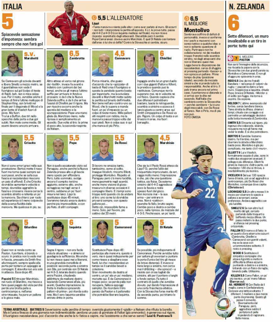 NELSPRUIT (Sudafrica) – La Gazzetta dello Sport non ha avuto mezze misure nel giudicare la prova degli azzurri contro la Nuova Zelanda. Male Cannavaro in difesa, il capitano azzurro ha sofferto la fisicità degli attaccanti neozelandesi. Anche Marchisio a centrocampo non ha saputo dare il proprio contributo, mentre il migliore in campo degli azzurri è stato il centrocampista della Fiorentina Riccardo Montolivo.
