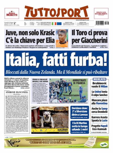 Sul quotidiano torinese Tuttosport si parla del Mondiale dell’Italia di Marcello Lippi che dopo due giornata si ritrova con due soli punti dopo i pareggi contro il Paraguay e contro la Nuova Zelanda. Ieri il centrocampista della Juventus Marchisio ha criticato il c.t. azzurro reo di aver fatto troppi cambi tattici nelle due partite dei Mondiali. Si rischia una clamorosa eliminazione.
