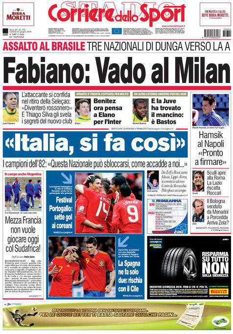 Sul Corriere dello Sport si parla del calciomercato di Inter, Milan e Juventus con l’attaccante del Brasile e del Siviglia Luis Fabiano che avrebbe confidato nello spogliatoioi di essere ad un passo dai rossoneri. L’Inter di Benitez invece cerca il centrocampist Elano mentre la Juventus sembra aver trovato l’esterno giusto: Michel Bastos, esterno sinistro del Lione.