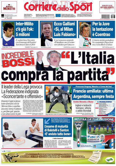 Sul Corriere dello Sport si parla dell’incredibile dichiarazioni di Umberto Bossi, leader del partito Lega Nord, che ad un giorno dall’incontro importante tra l’Italia e la Slovacchia ha dichiarato di essere certo di una vittoria della Nazionale azzurra perchè avrebbe già comprato la partita. Dichiarazioni pesanti e offensive che hanno fatto infuriare la Federazione italiana.