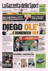 Sulla Gazzetta dello Sport si parla del Mondiali di Argentina e Francia. La formazione sudamericana allenata da Diego Armando Maradona è approdata gli ottavi di finale a punteggio pieno dopo aver battuto anche la Grecia per due reti zero. Clamorosa eliminazione della Francia di Domenech che ha perso due a uno contro il Sudafrica di Parreira, ed in Francia scoppiano le polemiche.