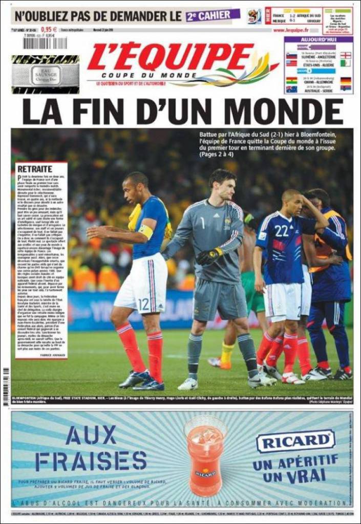 Il quotidiano francese L’Equipe parla della fine di un mondo riferendosi alla clamorosa eliminazione dagli ottavi di finale della Francia di Domenech che arriva ultima nel girone A dopo la sconfitta contro il Sudafrica per due a uno. La gestione Domenech fallisce clamorosamente ed ora i transalpini volteranno pagina con l’arrivo in panchina di Laurent Blanc, ex tecnico del Bordeaux.