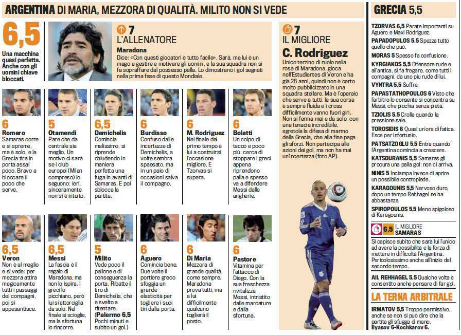 CITTA’ DEL CAPO (Sudafrica) – Dopo aver visto i voti di ‘Gazzetta dello Sport’ per le partite del pomeriggio, eccoci alla serata di ieri: chiuso anche il girone B, dominato dall’Argentina di Messi, vittoriosa anche nell’ultima gara contro la Grecia. ‘Albiceleste’ a punteggio pieno e con un Maradona scatenato, vero protagonista di questa prima fase a gironi, per il resto abbastanza povera di spettacolo…