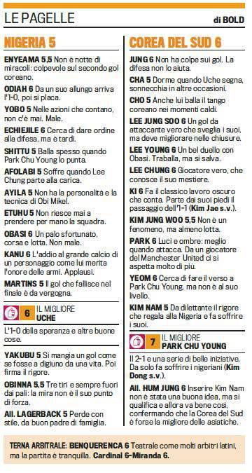 Infine ecco le pagelle della rosea per Nigeria-Corea del Sud, con gli asiatici qualificati grazie al pareggio ed alle mille occasioni sprecate dagli africani: