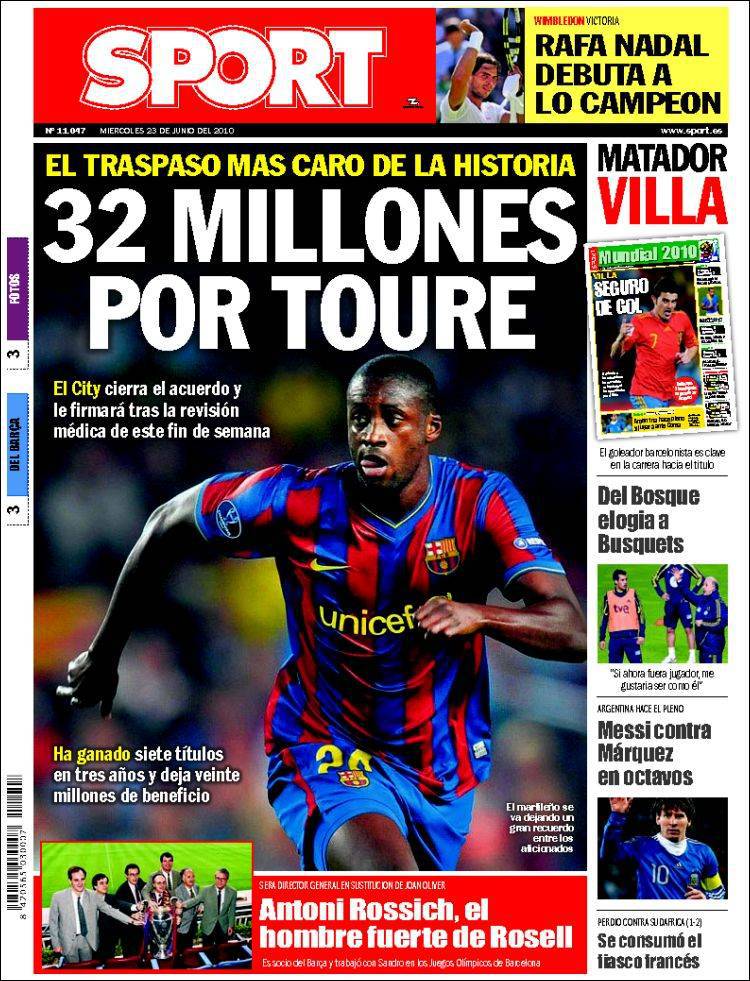 Sull’altro quotidiano catalano Sport si parla dell’imminente acquisto di Yaya Tourè da parte del Manchester City. Il giocatore ivoriano, in forza al Barcellona, dovrebbe essere venduto per la cifra record di 32 milioni di euro, soldi che il nuovo presidente dei blaugrana, Sandro Rosell, ha già dichiarato di voler investire per comprare un campione che possa sostituire il giocatore africano.