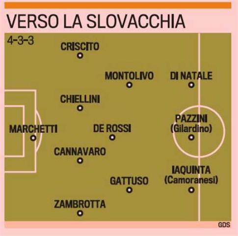 CENTURION (Sudafrica) – Marcello Lippi annuncia qualche cambiamento nella formazione che domani affronterà la Slovacchia nell’ultimo e fondamentale match del girone. Per gli azzurri tre punti d’obbligo per centrare la qualificazione, per questo il c.t. azzurro ha in mente un 4-3-3 con l’innesto di Gattuso a centrocampo e Pazzini in attacco. Ecco la formazione secondo la Gazzetta dello Sport.