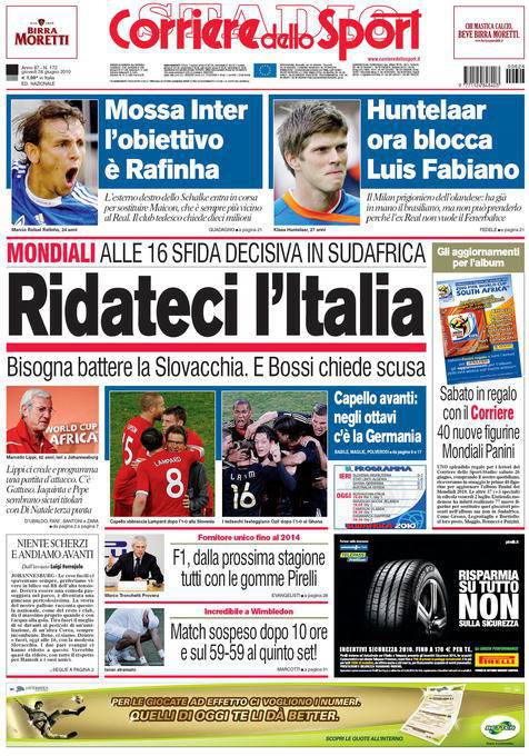 Anche il Corriere dello Sport è concentrato sulla grande partita di questo pomeriggio tra Italia e Slovacchia. Un successo permetterebbe agli azzurri di qualificarsi agli ottavi di finale e se il Paraguay non dovesse vincere contro la Nuova Zelanda i ragazzi di Marcello Lippi passerebbero come prima del girone evitando l’accoppiamento pericoloso contro l’Olanda di Sneijder e compagni.