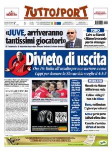 Il quotidiano torinese Tuttosport parla di un’Italia pronta a tutto per vincere il match contro la Slovacchia in programma questo pomeriggio ore 16 che potrebbe qualificare la Nazionale di Marcello Lippi agli ottavi di finale. In caso di secondo posto c’è il serio rischio di incontrare l’Olanda dei vari Sneijder, Robben, Van Persie, ma tutto dipenderà dal match del Paraguay contro la Nuova Zelanda.