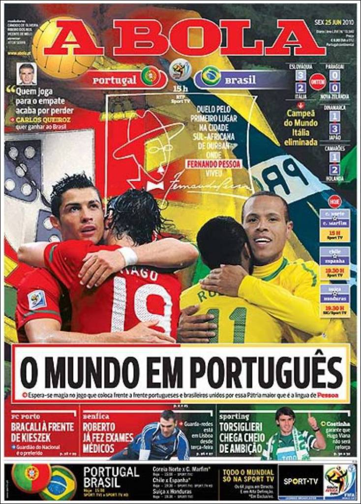 Grande trepidazione in Portogallo per la sfida per la formazione lusitana ed il Brasile. Il quotidiano A Bola concede ampio spazio alla grande sfida tra Cristiano Ronaldo e Robinho, tra Tiago e Felipe Melo. Due formazioni che amano giocare lo stesso calcio fatto di grandi giocate e puro spettacolo, chi vince si qualificherebbe agli ottavi di finale in testa al girone. Assente Kakà per squalifica.