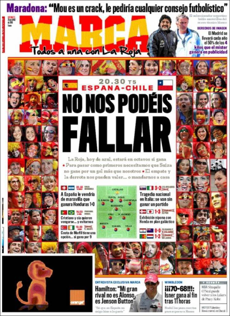 Sul quotidiano spagnolo Marca si parla della Nazionale spagnola allenata da Vicente Del Bosque che questa sera sarà di scena contro il Chile. Una sfida importante ai fini della qualificazione, infatti in caso di mancata vittoria per gli spagnoli le porte degli ottavi di finale sarebbero praticamente chiuse. C’è molta attenzione nei confronti della squadra sudamericana che ha dimostrato di avere giovani interessanti.