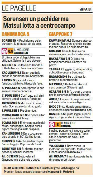JOHANNESBURG (Sudafrica) – Il Giappone batte la Danimarca con un netto 3-1 ed accede agli ottavi di finale della Coppa del Mondo. A brillare è stato il giocatore nipponico del CSKA Mosca, Honda, autore di una prestazione eccellente arricchita da uno spettacolare gol su calcio di punizione. Tra gli europei si salva solo Jacobsen. Ecco le pagelle della ‘Gazzetta dello Sport’.