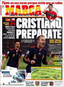 Il quotidiano spagnolo Marca sceglie un titolo battagliero per omaggiare il passaggio agli ottavi di finale della Spagna di Del Bosque che ha vinto per due a uno contro il Cile e si è qualificata agli ottavi di finale come capolista del girone. Ora negli ottavi grande sfida contro il Portogallo di Cristiano Ronaldo, stella della formazione lusitana e del Real Madrid di Josè Mourinho.