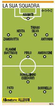 MILANO – Oggi la Gazzetta dello Sport riporta una formazione che secondo il quotidiano milanese, sarà quella adottata dal neo tecnico milanista Massimiliano Allegri per la prossima stagione. Nell’undici titolare però non ci sono acquisti, c’è da valutare anche che se il Milan farà qualche acquisto di calciomercato lo schieramento tattico o qualche giocatore in formazione potrebbe cambiare. Il modulo adottato dall’ex tecnico cagliaritano è il 4-3-1-2 con Ronaldinho trequartista a supporto delle due punte Pato e Borriello.