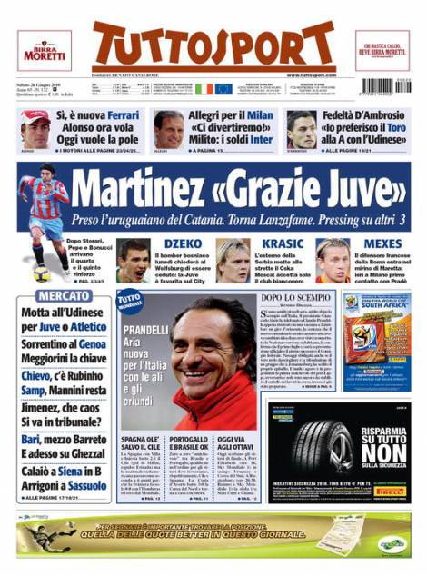Sul quotidiano torinese Tuttosport si parla del calciomercato della Juventus con l’acquisto di Martinez dal Catania. Il giocatore ha trovato l’accordo con i dirigenti bianconeri, ora mancano solo le visite mediche e la firma sul contratto. Dopo l’uruguagio la Juventus cercherà di concludere altre tre trattative, ovvero quelle di Dzeko, Krasic e Mexes difensore della Roma.