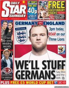 LONDRA (Inghilterra) – Oggi ore 16,00 grande match in questo Mondiale in Sudafrica per la seconda giornata dei quarti di finale ci sarà infatti Germania-Inghilterra ed il Daily Star dedica la prima pagina a questa gara molto attesa con Rooney che lancia la sfida ai tedesschi. L’attaccante del Manchester United non è ancora recuperato bene dall’infortunio e infatti non ha realizzato neanche un gol.