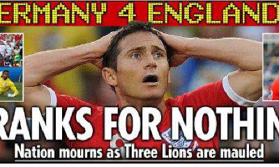 PRETORIA (Sudafrica) – La Germania batte 4-1 l’Inghilterra e al triplice fischio finale i toni dei giornali sono ovviamente diametralmente opposti. La Bild sulla prima pagina osanna i propri eroi con un “Grazie ragazzi, è stato incredibile!” continuando con un eloquente “La Germania mortifica l’Inghilterra anche grazie a un gol fantasma, il 1966 è vendicato“. Nell’Oltremanica i toni sono decisamente più cupi: “Tre Leoni macinati dalla Germania” titola il Mirror.