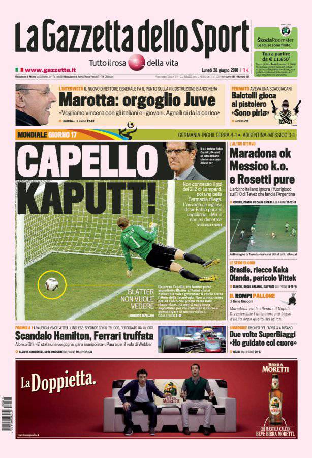 MILANO – Il quotidiano in rosa dedica la prima pagina ai Mondiali in Sudafrica ed all’eliminazione dell’Inghilterra di Sir. Fabio Capello. La partita è stata però viziata da una clamorosa svista arbitrale, quando sul 2 a 1 non è stato concesso il sacrosanto goal del pareggio a Lampard. Tutta l’Inghilterra grida allo scandalo, la Germania parla di vendetta dopo la finale di Wembley del 1966.