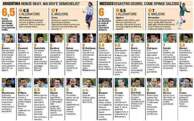 MILANO – L’ottima prestazione degli uomini di Diego Armando Maradona, sommata alla scabrosa difesa messicana, spiana la strada all’Argentina che approda ai quarti di finale nei quali affronterà una Germania in eccellenti condizioni psicofisiche. Ecco le pagelle della ‘Gazzetta dello Sport’ relative al match tra Argentina e Messico.