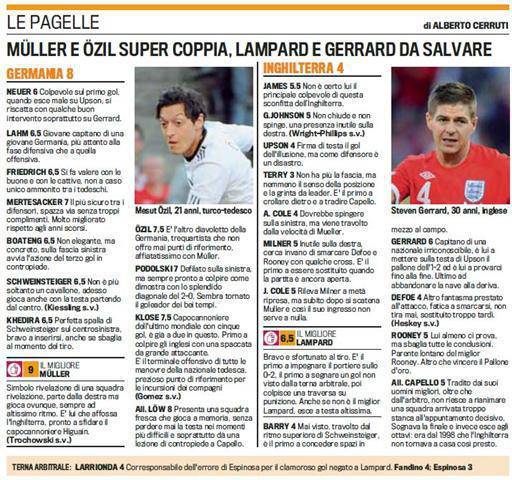 MILANO – La Germania si sbarazza abbastanza agilmente dell’Inghilterra con un netto risultato di 4-1, anche se la partita è stata viziata da un clamoroso ‘gol fantasma’ non assegnato alla ‘Nazionale di Sua Maestà’ messo a segno da Frank Lampard, l’unico tra i suoi compagni a salvare la faccia. Ecco le pagelle della ‘Gazzetta dello Sport’ che premiano i tedeschi con voti decisamente superiori alla media.
