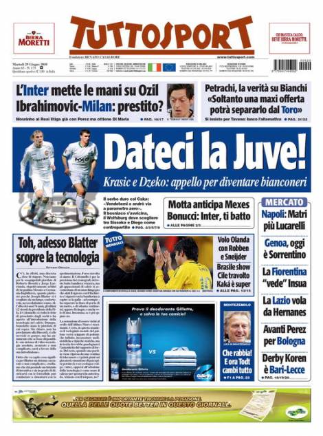 Sul quotidiano torinese Tuttosport si parla del calciomercato Juventus e del futuro di Milos Krasic e Edin Dzeko. Il primo, esterno serbo del Cska Mosca, vuole assolutamente vestire il bianconero, per questo ci saranno ulteriori incontri tra le due dirigenze. Il secondo, attaccante bosniaco del Wolfsburg, ha dichiarato di voler provare una nuova avventura, il campionato italiano lo affascina.
