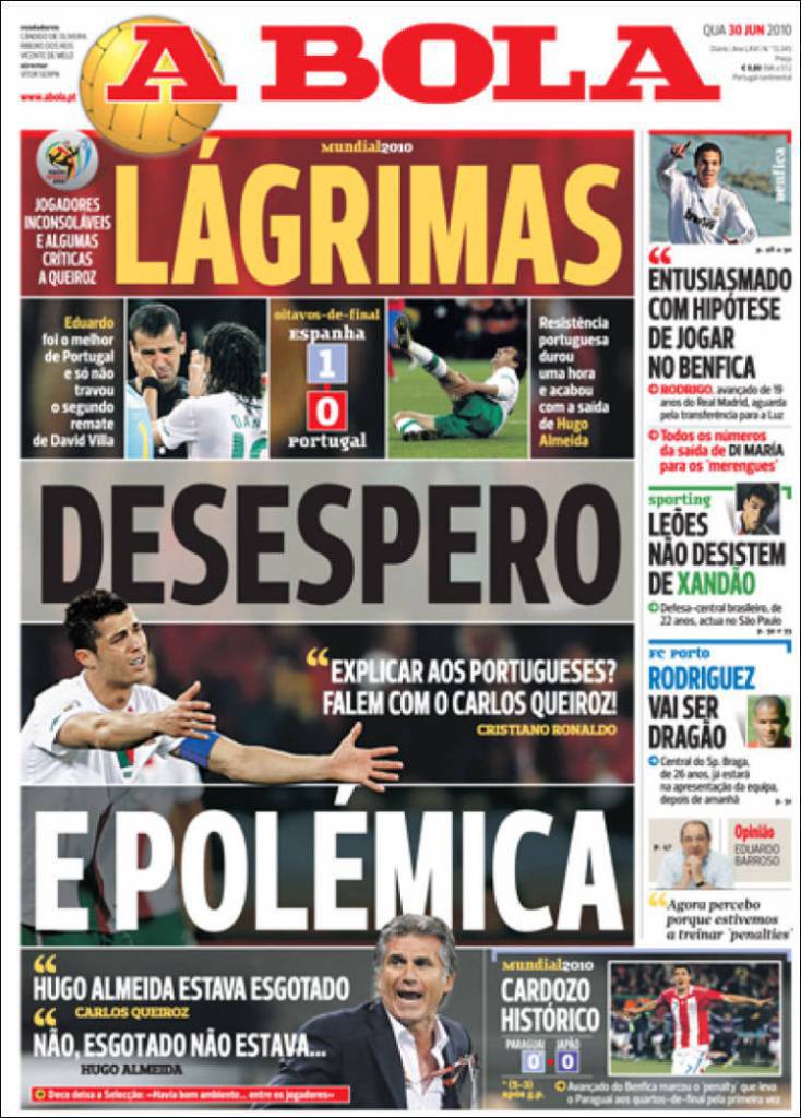 Il quotidiano portoghese A Bola ovviamente è deluso dall’eliminazione del Portogallo per mano della Spagna negli ottavi di finale del Mondiale sudafricano. Il gol di Villa ha mandato in frantumi il sogno dei portoghesi e di Cristiano Ronaldo, anche se il giornale lusitano polemizza per il gol di Villa in leggero fuorigioco e di alcune decisioni arbitrali che non sono piaciute.