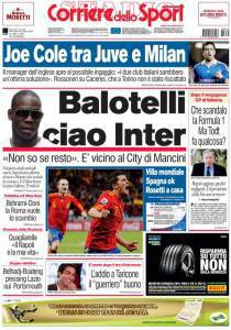 Sul Corriere dello Sport si parla del calciomercato dell’Inter che ieri ha dovuto subire l’ennesima dichiarazioni di fuoco di Mario Balotelli che all’uscita dalla scuola per la maturità, ha dichiarato di non essere sicuro di restare all’Inter. Il Manchester City di Roberto Mancini è vicinissimo al giovane talento nerazzurro, ed è pronto a fare follie per portarlo in Inghilterra.