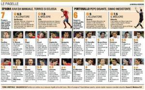JOHANNESBURG (Sudafrica) – La Spagna vince contro il Portogallo per uno a zero e si qualifica ai quarti di finale del Mondiale sudafricano. Grande protagonista dell’incontro il nuovo attaccante del Barcellona David Villa autore del gol decisivo, mentre nel Portogallo grande assente Cristiano Ronaldo che ha perso il confronto con il giocatore spagnolo. Ecco le pagelle della Gazzetta dello Sport.