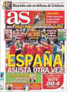 Il quotidiano madrileno As elogia la Spagna di Vicente Del Bosque che nei quarti di finale troverà il Paraguay. Gli spagnoli dopo la vittoria al Campionato europeo del 2008 puntano all’accoppiata con il Mondiale. Adesso nella squadra spagnola c’è la convinzione di poter vincere qualcosa di importante anche a livello Mondiale sfidando il Brasile di Carlos Dunga.