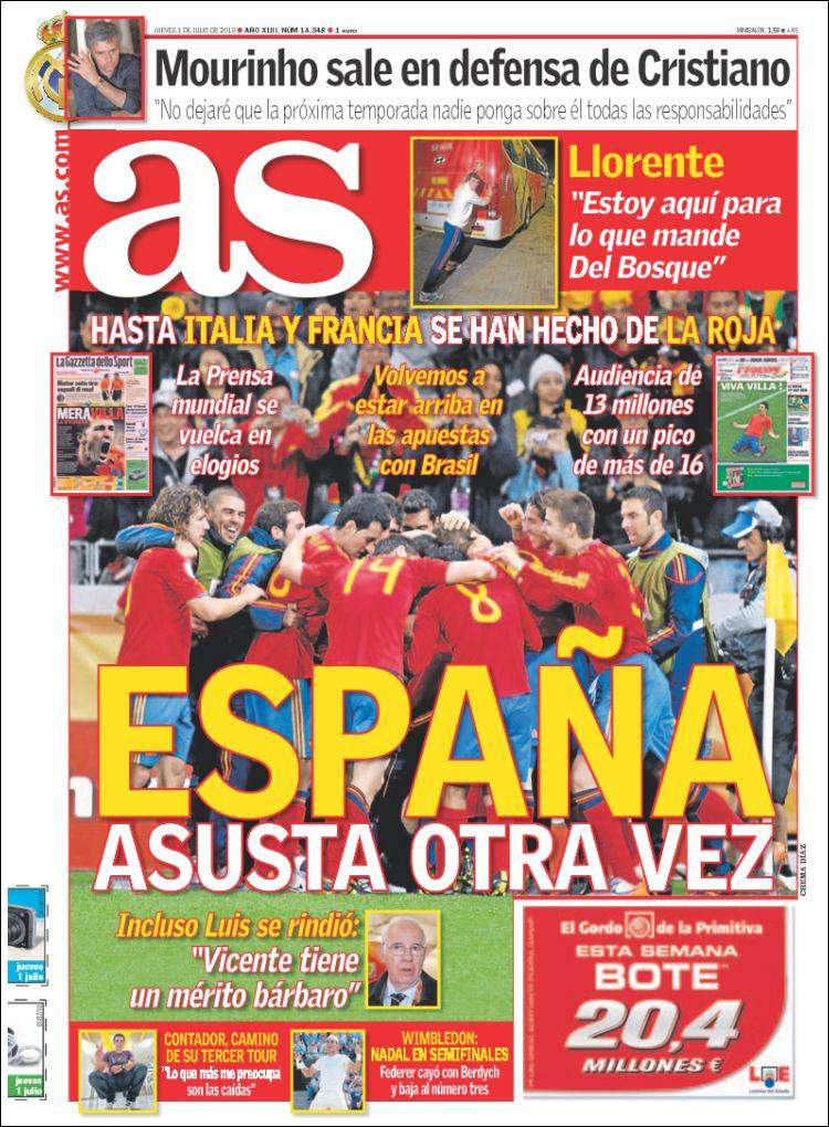 Il quotidiano madrileno As elogia la Spagna di Vicente Del Bosque che nei quarti di finale troverà il Paraguay. Gli spagnoli dopo la vittoria al Campionato europeo del 2008 puntano all’accoppiata con il Mondiale. Adesso nella squadra spagnola c’è la convinzione di poter vincere qualcosa di importante anche a livello Mondiale sfidando il Brasile di Carlos Dunga.