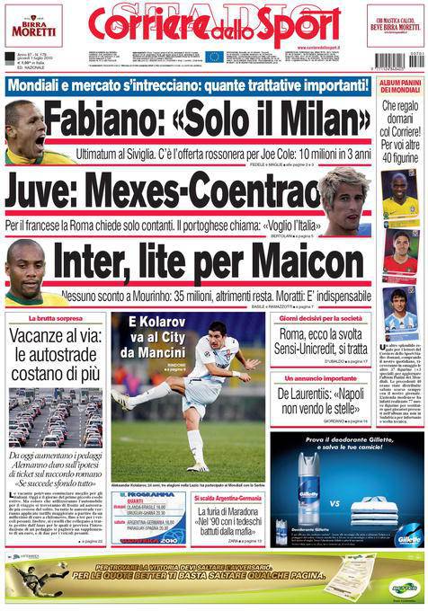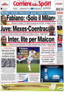 Sul Corriere dello Sport si parla dei movimenti di mercato di Inter, Milan e Juventus. In particolare in casa nerazzurra si parla della lite con il Real Madrid per Maicon, terzino brasiliano che piace al Real Madrid. La società meneghina chiede 35 milioni di euro mentre i madrileni sono disposti a versarne solo 28. Intanto il presidente Moratti ha dichiarato che il brasiliano è indispensabile.