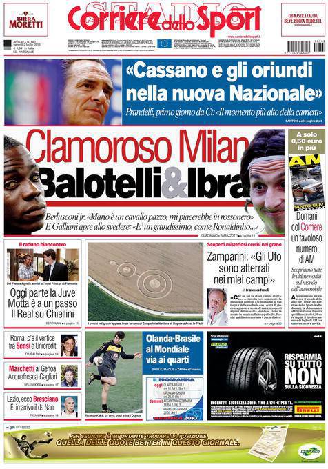 Sul Corriere dello Sport titolo bomba sul calciomercato del Milan. Ieri PierSilvio Berlusconi ha elogiato il talento dell’Inter Mario Balotelli sponsorizzando un suo eventuale acquisto, mentre Adriano Galliani ha elogiato Zlatan Ibrahimovic, attaccante svedese del Barcellona paragonandolo a Ronaldinho. Tuttavia il manager dei due giocatori Raiola ha chiuso le porte.