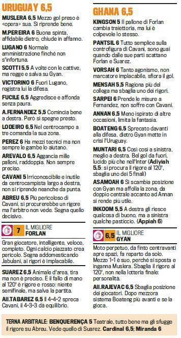 JOHANNESBURG (Sudafrica) – Ieri sera si è giocata la seconda partita valevole per i quarti di finale di questo Mondiale tra l’Uruguay ed il Ghana. La partita è stata, a detta di molti, giocata meglio dagli africani che hanno addirittura sbagliato un rigore al 120esimo minuto dopo esser andati ai tempi supplementari, la gara si è decisa così ai calci di rigore. Ecco le pagelle prese dalla Gazzetta dello Sport.
