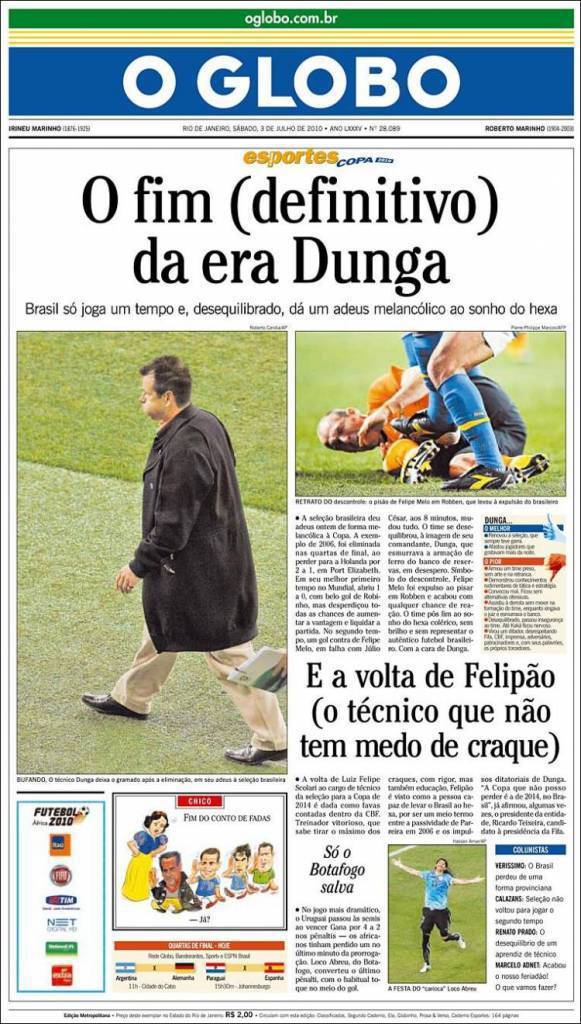 Il quotidiano brasiliano O Globo parla della clamorosa eliminazione del Brasile ai quarti di finale dei Mondiali sudafricani per mano dell’Olanda di Sneijder. Il Brasile era passato in vantaggio con Robinho ma nel secondo tempo la squadra verdeoro ha subito la rimonta degli orange. Espulso Felipe Melo autore di un secondo tempo disastroso e sommerso dalle critiche dei brasiliani.