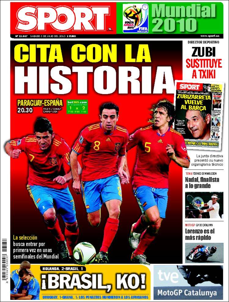 Sul quotidiano catalano Sport si parla della sfida di questa sera tra Paraguay e Spagna nei quarti di finale del Mondiale sudafricano. La squadra di Del Bosque vuole centrale la semifinale ma i paraguayani sono un osso duro e alla vigilia il c.t. Martino ha cercato di caricare di tensione l’atmosfera. Le “Furie Rosse” spagnole contano molto sullo scatenato David Villa.